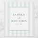 This elegant wedding wine label features a minimalist design with a central white square framed by thin green lines, set against vertical light green stripes. The colour palette includes muted greens and whites, creating a fresh and calming aesthetic perfect for celebrating special moments. The typography is clean and sophisticated, with customisable names and dates, allowing you to personalise the labels effortlessly. Ideal for weddings or anniversaries, this design exudes tranquillity and modern elegance, making it a stylish addition to any celebration.