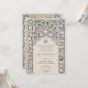 This sophisticated wedding invitation marries the timeless elegance of navy blue with the softness of cream, presented through an exquisite Islamic lace design. The invitation showcases a detailed navy blue background with cream-coloured lace patterns, echoing the intricate artistry found in traditional Islamic motifs. The architectural arch design at the top of the front side elegantly frames the wedding details, written in a complementary cream hue. The back continues the theme with a full-length column of the lace pattern, leaving space for additional information or a personal message. This design, rooted in cultural beauty, is an impeccable choice for couples who wish to make a statement of elegance and heritage.