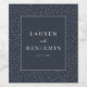 This elegant wedding wine label features a sophisticated navy blue background adorned with a subtle grid of white dots, creating a refined border. The design showcases centred text in an elegant serif font, allowing for customisable names and dates to be displayed prominently. Its minimalist style emphasizes clarity and balance, making it perfect for celebrating your special day with a touch of timeless charm. Ideal for weddings, this label adds a formal yet understated aesthetic to any bottle, capturing the joyous occasion beautifully.