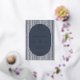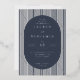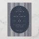 This elegant wedding invitation features a sophisticated design with a vertical oval layout framed by alternating dark blue and white stripes, set against a light marble background. The colour palette of deep navy blue and crisp white creates a striking contrast, enhancing the formal and timeless aesthetic. A clean serif font is used for the customisable text, ensuring clarity and elegance while maintaining a modern feel. Perfect for couples seeking a classic yet contemporary look, this invitation sets the tone for a memorable celebration.