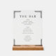 This acrylic sign features a classic, symmetrical layout with elegant geometric corner designs and a clean white background. The sophisticated serif typography highlights the categories "The Bar," "Beer," "Wine," and "Spirits," each listing various drink options in an organized manner. The design exudes a timeless and refined mood, perfect for enhancing the ambiance of any bar or home entertainment area. Its balanced composition and clear hierarchy make it both visually appealing and functional, ideal for showcasing your beverage selection.