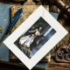 A black haired sorceress wearing all white and gold holding her dragon staff with one hand and the other has the reins of a black dragon. The two are on a cliff edge path with two pillars in behind them