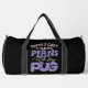 This humourous black duffle bag features the playful phrase "Sorry I Can't I HAVE PLANS With My PUG." The vibrant pink and purple distressed text adds a fun and lively touch. Perfect for pug lovers, this bag is a wonderful way to express your devotion to your furry best friend and your preference for their companionship. Edit colour of the bag caps and body in the Design tool to your favored colours.