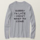 Funny shirt will get you through the Holidays. It says SORRY I'M LATE I DIDN'T WANT TO COME. What a Great Gift for a family member! Put a SMILE on their face.