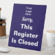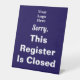 You can edit the white display text to create a custom message for your business. The dark blue sign says: Sorry, This Register Is Closed. The top line of the display text is a script. An image is above the text. You can replace the image with your company logo.