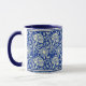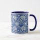 This ceramic mug features a mass of ivory-coloured carnations and other common cottage flowers strewn about, helter-skelter, against a medium sailor blue background, a pattern inspired by a favourite Victorian-era wallpaper design.