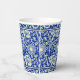 This paper cup features a mass of ivory-coloured carnations and other common cottage flowers strewn about, helter-skelter, against a medium sailor blue background, a pattern inspired by a favourite Victorian-era wallpaper design.