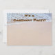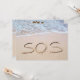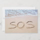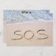 5” x 7” pearl shimmer invitation with an image of the distress signal SOS drawn on a sandy beach. The back has the same image but without the SOS.