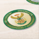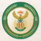The national coat of arms of South Africa, is infused into the center of a faux gold rimmed circle shape. Around this image, is a faux gold laurel wreath which completes the design.
