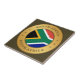 The South African flag is inset into a rounded faux gold ring. The words "South Africa" feature at the top and bottom of the design, and are of a pressed effect. The pair of three decorative stars across from each other, are also designed with a pressed effect.