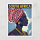 A dramatic and vibrant vintage-style travel poster for South Africa. The artwork features a stunning, profile portrait of a woman wearing a richly colored, geometric headwrap and traditional yellow beaded jewelry. A stylized map of Africa serves as the subtle background. This beautiful illustration celebrates African culture and is perfect for travel enthusiasts, collectors of retro portrait art, and anyone who appreciates bold, cultural designs.