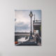 A lone lamp post, crowned with a golden fish—an iconic detail from the city's Victorian riverside design—stands sentinel at the water’s edge. Its quiet glow contrasts against the heavy gray clouds and weathered stone of the surrounding bridges.