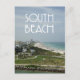 South Beach, Miami, Florida landscape scene of the beach and skyline with the words "South Beach" at top in an art deco style font.