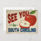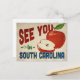 A charming South Carolina vintage travel postcard featuring a lovely red apple, along with fun retro style text that says, "See you in South Carolina"