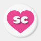 This magnet features a shapely and vibrant hot pink heart containing the bold, rounded, white lower case letters sc, a playful version of the abbreviation for South Carolina, the palmetto state.