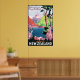 The South Island of New Zealand. A vintage view of mountains, a lake and people camping on the shore. A colorful restored copy.