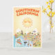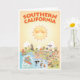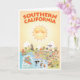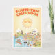 This greeting card is a spectacular cartoon of Southern California – Los Angeles, Anaheim, Long Beach, San Diego. This charming scene has it all – a surfer hangs ten while a mermaid lounges on a rock, a killer whale leaps out of the water, a muscular beach couple both flex to impress, zoo animals wait for tourists, a bull smashes into a bull-fighter, and much more…
