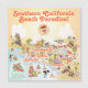 A cartoon of Southern California – showcasing Los Angeles, Anaheim, Long Beach, San Diego and other cities plus most beaches. Cartoon characters of all sorts swim and splash and play beneath the bright California sun shining high above it all.