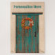 This design features a colorful chile pepper ristra wreath tied with a raffia bow on a rustic weathered blue wood door at an old adobe house. The original painting was inspired by the chile ristras and wreaths the artist hung at her home in New Mexico. Ristras are a symbol of welcome said to bring good health and good luck.