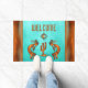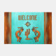 Personalise this Unique "One of a Kind" Southwest Kokopelli Doormat! It Features a Two Copper Kokopelli Playing the Flute and Dancing Around a Cactus Under the Sun on a Turquoise Background...Surrounded by a Copper Border!