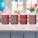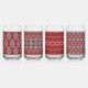 Four different original designs in bold red and turquoise geometric patterns on a set of four coordinated glasses created by Artellus. The artist was inspired by the colours and patterns around her home in the desert southwest.