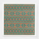 An aged, oxidised, verdigris copper patina coloured design with modern geometric borders in coppers, teals and turquoise inspired by the colours and patterns of the artist's home in the desert southwest.