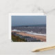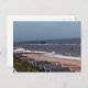 Postcard featuring a photo of picturesque Southwold in Suffolk, England. View of the sea and roofs of beach huts with the pier in the distance.