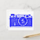 A postcard with a high contrast image of a vintage Soviet Russian range finder camera from the 1950s/60s.
