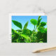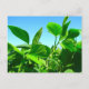 Postcard featuring healthy young soybean plants growing under a clear blue sky.