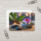 Beautiful image for a spa with a pink and purple lotus flower, surrounded by two black hot stones, tea light and a lush green plant. In the background is a soft bokeh.