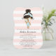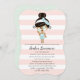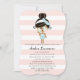 Cute spa day themed bridal shower invitations are perfect for a Let's Pamper the Bride bridal shower. A dark skin toned cutie wears a something blue robe with a white heart and a blue and white polka dot bow headband. A blush pink and white striped background on the front and a pale cucumber mint green and white polka dot heart pattern on the back. These spa themed invitations would not be complete without a red pedicure, white face mask and two cucumber slices for the blushing bride-to-be to feel relaxed, refreshed and pretty! Artwork © Chrissy H. Studios, LLC. All rights reserved.