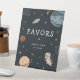 Cute space themed kids birthday favours pedestal sign featuring playful astronaut, planet and star illustrations paired with fun, stylish typography on different colour backgrounds. You can find more matching items from this collection in our store.