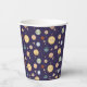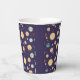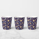 Cute space themed kids birthday paper cups featuring playful astronaut, planet and star illustrations in a seamless pattern on different color backgrounds. You can find more matching items from this collection in our store.