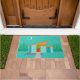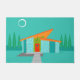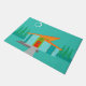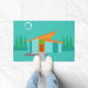 This Space Age Cartoon House Door Mat is a retro lover’s dream come true. The minimalist art design features an aqua stone house with large, peacock blue windows. Hanging from the atomic, slanting, orange roof, a yellow sputnik light fixture illuminates the front door. The recessed red front door with starburst doorknob is beautifully offset by the vertical green wood planks of the exterior entryway. A grey stone path cuts across the pristine lawn, which appears turquoise in the moonlight. Behind the house, a row of a tall, thin, trees point to the turquoise sky and the white silhouette of a full moon. While no people are visible, on a night like this, the kitschy house’s inhabitants are probably inside watching news footage of the astronauts.