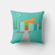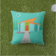 This Space Age Cartoon House Outdoor Pillow is a retro lover’s dream come true. The minimalist art design features an aqua stone house with large, peacock blue windows. Hanging from the atomic, slanting, orange roof, a yellow sputnik light fixture illuminates the front door. The recessed red front door with starburst doorknob is beautifully offset by the vertical green wood planks of the exterior entryway. A grey stone path cuts across the pristine lawn, which appears turquoise in the moonlight. Behind the house, a row of a tall, thin, trees point to the turquoise sky and the white silhouette of a full moon. While no people are visible, on a night like this, the kitschy house’s inhabitants are probably inside watching news footage of the astronauts.