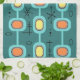 This atomic era styled mid century modern abstract art has circles, lines and sputnik starbursts. For lovers of midcentury kitsch designs. Multicolored and colourful with teal, turquoise, orange and yellow.