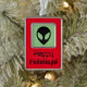 The combination of red and green background with the black alien head ensures that this ornament will stand out amongst traditional holiday decorations. Its design adds a touch of whimsy and mystery, creating an eye-catching focal point on your Christmas tree or in any other holiday display. Whether you're using it as part of a larger collection of Christmas decorations or as a standout piece of holiday decor, this ornament perfectly blends the charm of the holiday season with the excitement of space exploration and the unknown. It’s ideal for adding a touch of sci-fi flair to your holiday decor, making it a must-have for any fan of UFOs, flying saucers, or extraterrestrial life.