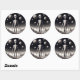 These stickers feel like something lifted from a mid-century science fiction digest—equal parts elegant and uncanny, with a stylised visual approach that honours the nostalgic charm of vintage extraterrestrial illustrations. Whether this enigmatic alien is a king, an ambassador, or simply a wise wanderer from a galaxy far away, the sense of cosmic gravitas he brings is unmistakable. The intricate background, filled with hovering spacecraft and celestial bodies, adds layers of story to the scene and invites viewers to imagine a larger universe where alien empires rise and fall under the glow of unfamiliar suns. The monochromatic palette only enhances the retro feel, making these stickers an effortlessly cool choice for fans of old-school sci fi and space-faring mythologies.