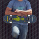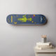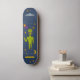 Create an out-of-this-world personalised gift. This skateboard deck features illustrations of a lime green space alien, a ufo or flying saucer, stars, a moon and planets and is ready to be personalised with a name.