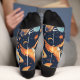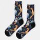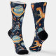 A blue pattern-based sock design with space and dinosaur themed drawings. Great for cosy moments and sci-fi lovers.