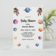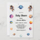 Outer space baby shower invitations feature solar system planets scattered around the edge, and an astronaut, which is easy to customise.