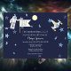 Having a space baby shower for a baby boy? Experience an outer space, countdown and splash down baby shower! Dark blue background with blue midnight stars, a little spaceman holding "It's A Boy!" flag, full yellow moon, and spaceship! Templates created for you.