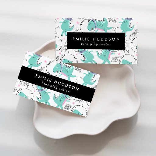 Cute, fun and adorable business cards with space dinosaurs. Modern and trendy design, perfect for kids play centres, playgrounds, activity centres, child care, day care, babysitters and nannies.