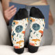 A white pattern-based sock design with space themed drawings. Great for cosy moments and sci-fi lovers.