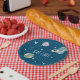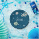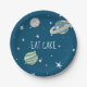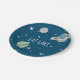 Cute birthday paper plates with a galaxy theme. The image shows some planets and blue stars. The illustration looks like it's in three dimensions but this is only a print. Illustrated and designed by Patricia Alvarez.