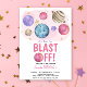 Magical galaxy outer space themed birthday invitation. Planets and stars in pink, purple, gold colorway.