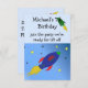 A bright space rocket in blue, red, and green blasting off to the moon. Blue background with a starry sky. Customise with all of your childs birthday information as desired.