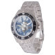Has heft and feel of expensive stainless steel quartz watches. Good band with safety catch. I removed links, which is easy because engraved arrows show direction to push the linking pins. As always by this seller, the image (a railroad logo) is a perfect reproduction of my emailed image, and is precisely spaced and aligned.