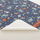 Space-themed sherpa blanket for kids or babies with a pattern of sloth astronauts floating in space alongside rocket ships, shooting stars, planets, moons, and alien spaceships in blue, rusty red, and yellow. Add your child's name in charming block letters.