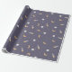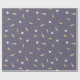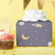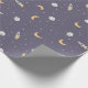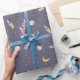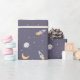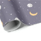 Space wrapping paper with celestial pattern featuring spaceships, planets, moons and stars on dark blue sky.